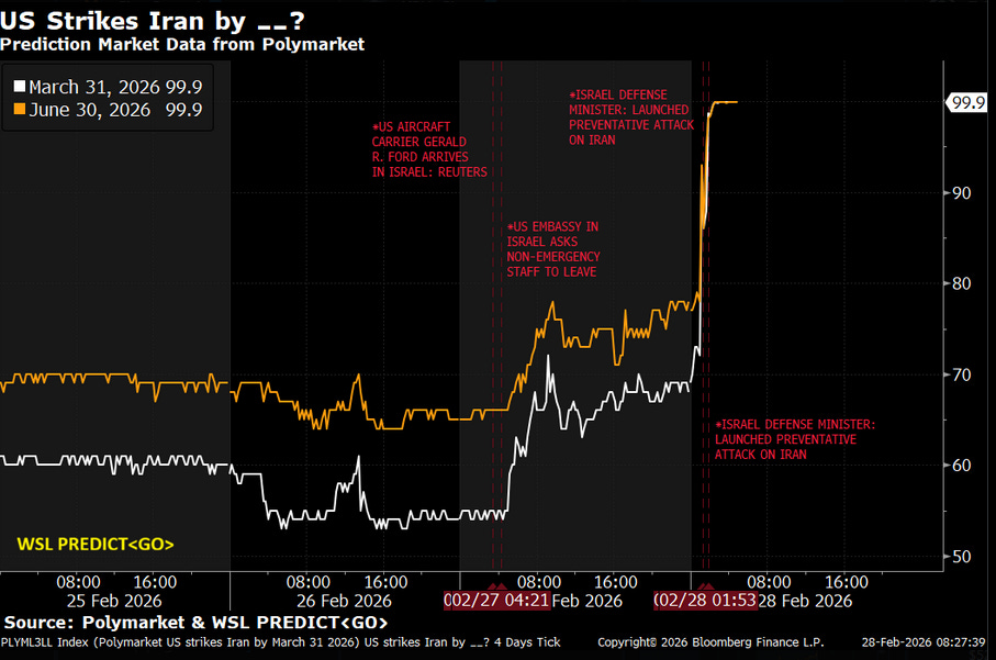 Feb 27 — The Ford arrives off Haifa. The U.S. Embassy orders non-emergency personnel to depart Israel. President Trump states, “All options remain available.” Probability moves to 68¢.